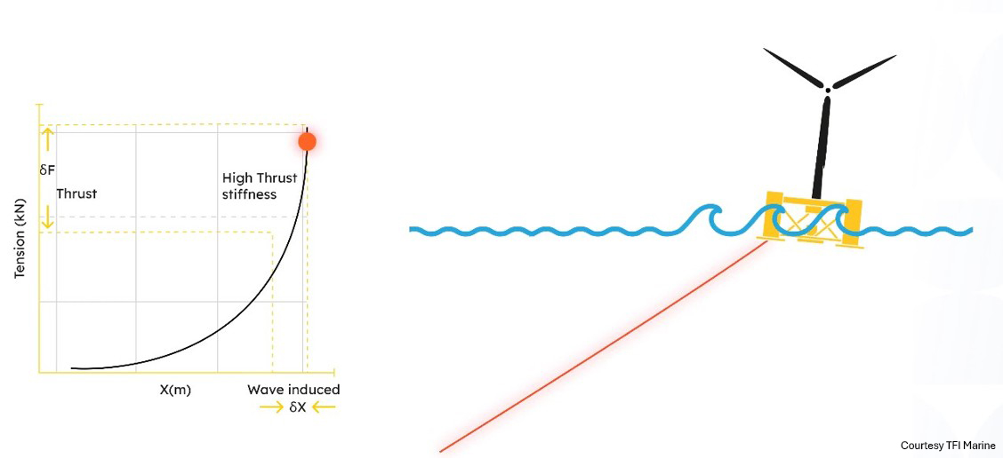 Our FibreMax’ dynamic stiffness optimized PolyMax – ‘Polyester made easy’ mooring lines offer up to 35% reduction in shock load levels compared to ‘traditional’ Polyester-based equivalents. A closely interlinked additional benefit is PolyMax’ linear behaviour, the (linear) relationship between wave-induced floater movement and thrust or tensional load in the mooring-line. PolyMax mooring lines therefore act functionally as a ‘natural’ shock absorber via the required compliance in the mooring system, which effectively eliminates the need for a separate mooring-line-incorporated shock absorber. However, this is exactly what at least one known FOW turbine supplier has done by combining his ‘traditional’ mooring lines with shock absorbers, and here in shallow-water conditions known as the most demanding operating condition.