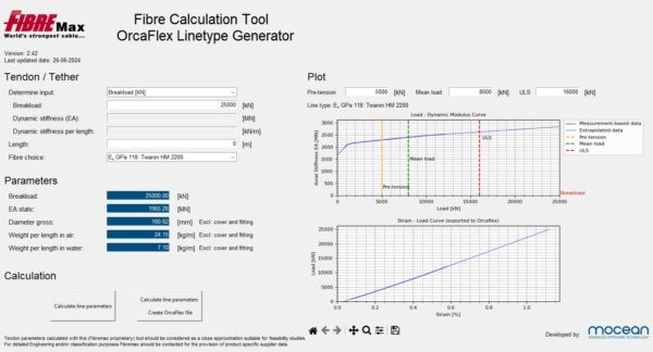 We are proud to announce that we have been working diligently with our Fiber-Partners Dyneema, Teijin Aramid, and our technology partner Mocean Offshore to develop a software solution that allows users to validate the dynamic stiffness behavior based on their defined mooring line values.